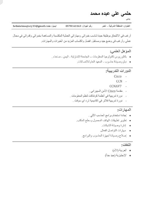 اتمنى أن تكونوا بخير اسمي محمد كامل حديث التخرج من معهد نظم المعلومات تخصص تقنية المعلومات. لدي اهتمام كبير بمجالات دعم الأنظمة، الشبكات، الأمن السيبراني، وتطوير البرمجيات، وأسعى لاكتساب خبرة عملية في بيئة مهنية محفزة. أود الاستفسار اذا كانت هناك أي فرص تدريبية أو وظيفية متاحة في قسم تقنية المعلومات لديكم. سأكون ممتنا جدا لتوجيهك أو مشاركتي بأي فرصة مناسب