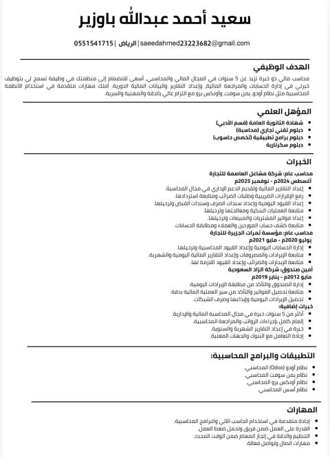 محاسب مالي ذو خبرة تزيد عن 5 سنوات في المجال المالي والمحاسبي وأسعى للانضمام الى منظمة في وظيفة تسمح لي بتوظيف خبراتي في ادارة الحسابات والمراجعة المالية واعداد التقارير والبيانات المالية الدورية، أملك مهارات متقدمة في استخدام الأنظمة المحاسبية مثل نظام أودو المحاسبي ونظام يمن سوفت ونظام أونكس برو المحاسبي ونظام أسس المحاسبي ونظام الأمازون المحاسبي مع التزام عالي بالدقة المهنية والسرية