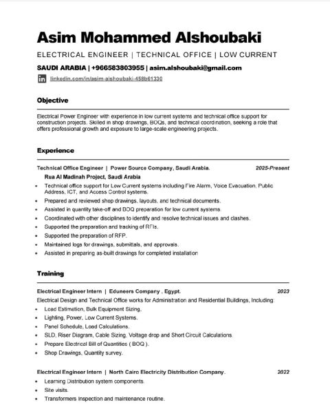 مهندس كهرباء خبرة أكثر من 7 سنوات في الاشراف والتنفيذ للأعمال الكهربائية في مشاريع الإنشاءات (الأبراج السكنية، الفنادق، والمنشاءات التعليمية) مع خبرة عملية في التشغيل والصيانة بعد التسليم. خبرة في أنظمة الجهد المنخفض LV أنظمة التيار الخفيف ELV (Fire Alarm - CCTV - Data - BMS) MDB - ATS - RMU اجادة برامج AutoCAD - ETAP - Revit متاح للعمل داخل المملكة