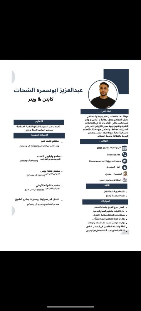 يوسف نبيل الجنسية يمني شاب مرتب وحق شغل العمر 23 ابحث عن عمل ونقل كفالة أكيد بعد التجربة من لصاحب العمل ولي كمان أجيد شغل البوافي كاشير ولف سندويشات وغيره من الأعمال مباشر خارج أي شغله أبدع فيها الحمدلله وشاي أحمر وعدني الى هو حليب وأجيد شغل المحلات مثل ملابس احذيه وأجيد ومستتعد لأي عمل أهم حاجة راتب كويس ويجي بوقته ما في تأخير شهادة صحي ما في قدمت وفحصت باقي الدراسة بسبب الظرووف