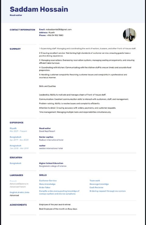 I am Saddam Hossain. I am Waiter, Captain, also Barista. I have a Experience this job