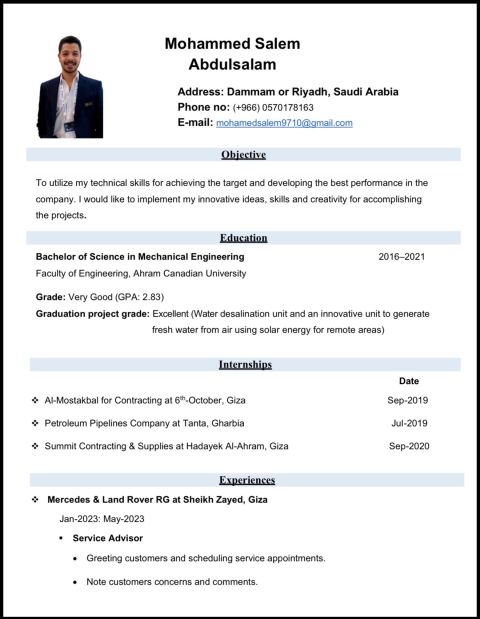 A mechanical power engineer is seeking a job in the automotive field as a service advisor 2 years of experience or workshop engineer 1 year of experience plus 2 years experience as a planning and operation engineer in Riyadh and Dammam. 7 months till registration in Saudi council of engineers