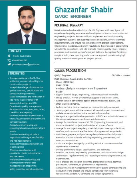 Dear HR, I am QA/ QC Engineer with experience in inspection, quality control, and documentation. Skilled in ensuring compliance with project specifications and international standards. Available immediately and open to new opportunities in Fit - out and Structural Projects