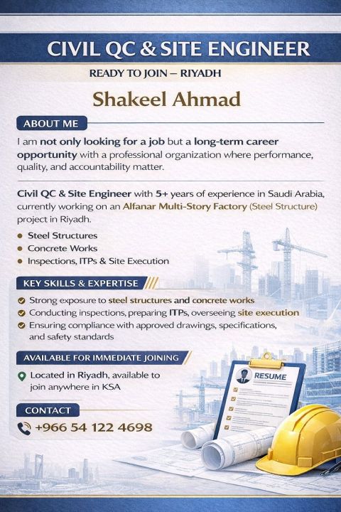 I am not only looking for a job but a long - term career opportunity with a professional organization. Civil QC & Site Engineer with 5 + years of experience in Saudi Arabia, currently working on the Alfanar Multi - Story Factory (Steel Structure) project in Riyadh. Experienced in concrete works, steel structures, and highways projects. Available for immediate joining with transferable Iqama and KSA