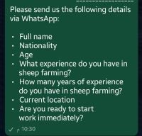 Sheep farm worker is required (Sending voice talk about your experience is totally required) Location Al Qassim region - East of Buraidah City - Hudayah District Salary 1000 SAR (food and transportation are included) Accommodation Provided on the farm The worker will be responsible for all daily tasks related to sheep farming. Previous experience is required. Contact WhatsApp only)