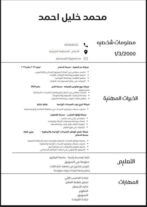 خريج بكالوريوس هندسة زراعية معي رخصة قيادة سعوديه وسيارة خاصه خبرة في مجال المبيعات والتسويق والاشراف والتحصيل اشتغلت في شركات زراعية مندوب مبيعات وشركة مكافحة حشرات تسويق ومبيعات وعقود وتحصيل فواتير واشتغلت في مجال العيادات البيطريه وعندي خبرة في المجال الطبي الخاص بالمختبرات ومتفرغ للعمل في أي وقت متواجد في الرياض