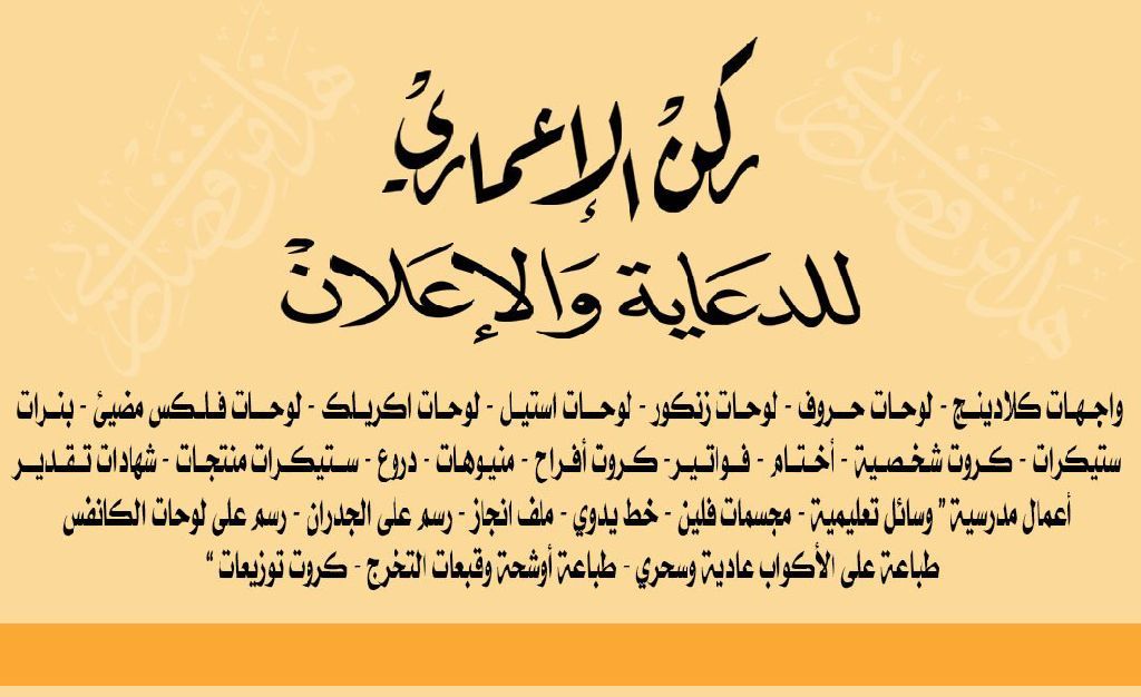 خطاط تنفيذ وتركيب لوحات الحروف البارزة والمضيئة (لوحات زنكور - لوحات أستيل - لوحات اكريلك) لوحات فليكس مضيئ - طباعة بنر ستيكر - أعمال مدرسية - رسم على الجدران مجسمات فلين - وسائل تعليمية - طباعة كروت طباعة بروشورات - طباعة على الاكواب - دروع