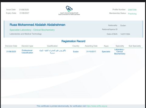 أنا عثمان سلمان سوداني الجنسية بكالوريوس وماجستير مختبرات طبية تخصص أحياء دقيقة خبرة 13 سنة حاصل على الهيئة السعودية للتخصصات الصحية تصنيف أخصائي أول إقامة قابلة للنقل خبرة داخل المملكة أكثر من عامان خبرة في فحص العمالة والمختبرات المرجعية