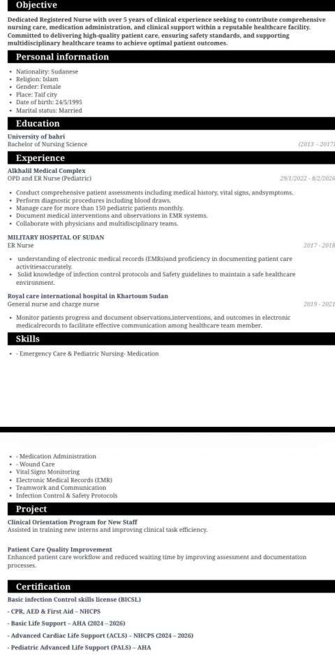 Licensed Registered Nurse with 6 years of experience in Internal Medicine, Surgery, Clinics, and Pediatric Emergency. Looking for a job opportunity in a medical complex, hospital, or private clinic in Al Baha region