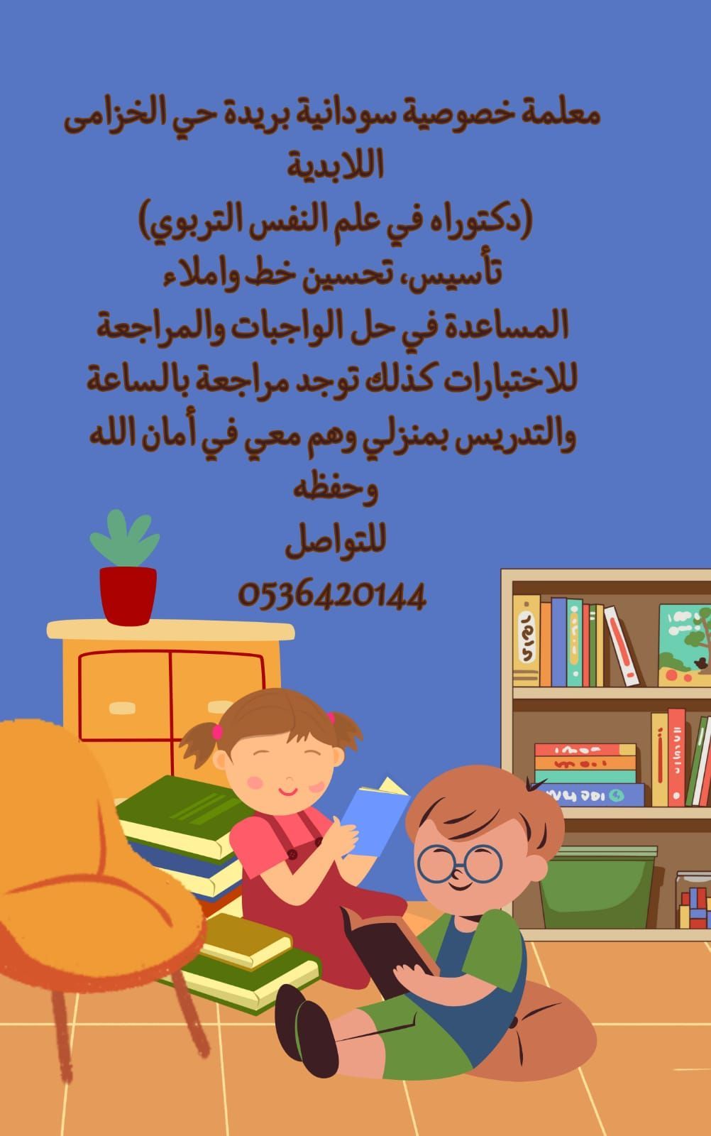 أستاذة خصوصية سودانية بريدة حي الخزامى اللأبدية للتأسيس ومراجعة الدروس المدرسية اليومية وتحسين الخط والأملاء والمساعدة في حل الواجبات