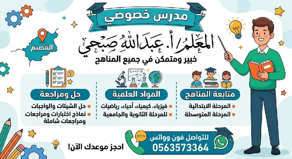 مدرس خصوصي لمتابعة المراحل الابتدائية والمتوسطة والمواد العلمية للمرحلة الثانوية والجامعات