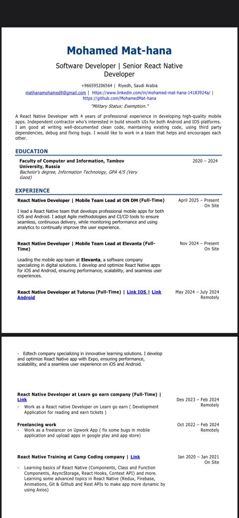 Professional Mobile App Developer with over 4 years of experience building high - quality Android & iOS applications using React Native. Experienced in EdTech apps, marketplaces, delivery apps, and custom business solutions, with several apps published on the App Store and Google Play. Based in Riyadh - Available for full time or Freelance projects Contact