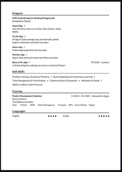 مبرمج تطبيقات Flutter مقيم في الرياض. عندي خبرة سنة ونصف داخل السعودية في تطوير تطبيقات الموبايل (Android & iOS) خبرة قوية في جلب والتعامل مع العملاء، إدارة وصيانة المواقع، وتحليل وتنفيذ متطلبات المشاريع بجودة عالية. ابحث عن فرصة عمل مناسبة في مجال Flutter Developer/ Software Engineer/ دعم فني تقني - المهارات باختصار Flutter - Dart - UI/ UX - Testing إدارة وصيانة مواقع WordPress