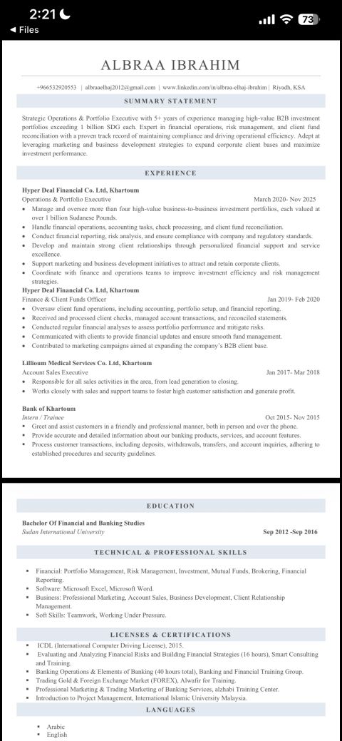أنا البراء إبراهيم سوداني الجنسية لدي خبرة 8 سنوات، عملت في التسويق وادارة المحافظ والصناديق الاستثمارية ولدي خبرة في مجال الصادر والوارد