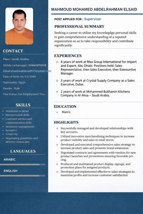 مندوب مبيعات ذو خبرة قوية في مجال البيع والشراء وإدارة العملاء، امتلك مهارات عالية في تحقيق أهداف المبيعات وزيادة الايرادات بناء علاقات طويلة الأمد مع العملاء التفاوض والاقناع واغلاق الصفقات إدارة المناطق البيعية ومتابعة التحصيل العمل الميداني وتحمل ضغط العمل عملت كمندوب مبيعات لسنوات، اضافة الى خبرة عملية في إدارة متجر (بقالة) لمدة 5 سنوات، مما عزز لدي فهم السوق واحتياجات العملاء