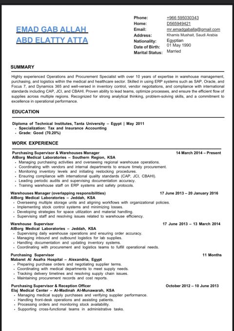 حاصل على دبلومه IFRS من معهد المحاسبين والمراجعين البريطانيين ACCA ابحث عن فرصة عمل مدير حسابات أو مدير مالي، خبرة 15 سنة منهم 10 سنوات داخل السعودية عملت في قطاع المقاولات وقطاع اللوجيستيه وقطاع التجزئة والاستثمار العقاري وعملت 5 سنوات في مصر مراجع خارجي (محاسب قانوني) خبرة في ادارة فريق العمل وخبرة في اعداد القوائم الماليه والتحليلات الماليه وخبرة ببرامج ERP مثل برنامج oodo وبرنامج view soft وبرنامج