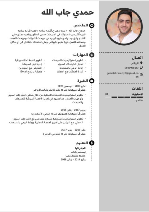 حمدي جاب الله 30 سنة مصري أقامه سارية رخصة قيادة سارية خبرة أكثر من 10 سنوات في المبيعات حسن المظهر وقدرة ممتازة في الاقناع ولبق جدا ولدي خبرة كبيرة في مبيعات الشركات ومبيعات العملاء ومستعد للعمل فورا مقيم في الرياض وعلي استعداد للانتقال الى أي مكان للعمل