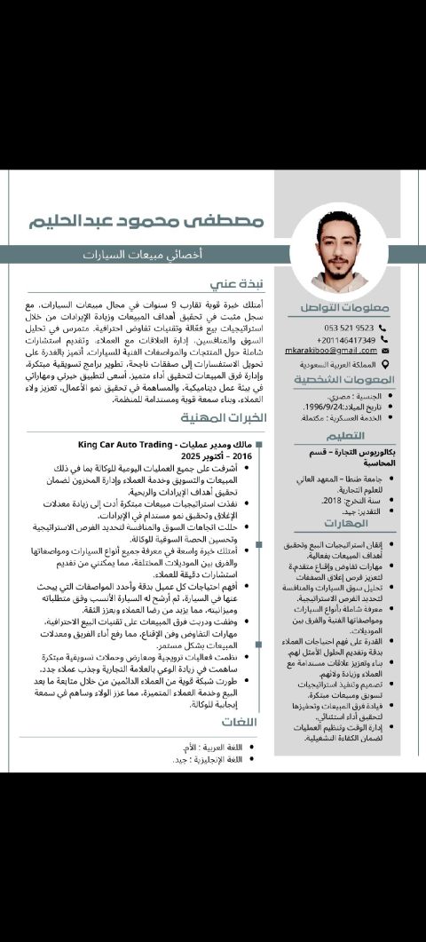 حاصل على بكالوريوس علوم زراعية خبرة في مبيعات الادوية البيطرية أكثر من 10 سنوات فمصر وعملت في السعودية مبيعات القهوة والحلويات وفي مبيعات الاسمنت إقامة سارية قابلة للنقل ورخصة خاصه سارية موجود في الرياض حاليا