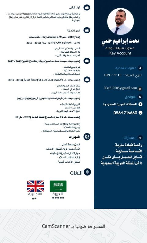 مدير مبيعات منطقة عملت لبعض الشركات الكبري خبرة بالمملكة فوق 25 سنة بالمبيعات والادارة الرياض مكة المكرمة والمدينة المنورة جدة تبوك عملت بشركة حلاوة طعمة وكورتينا البان والجميل كنزا ومياه صفا مكة