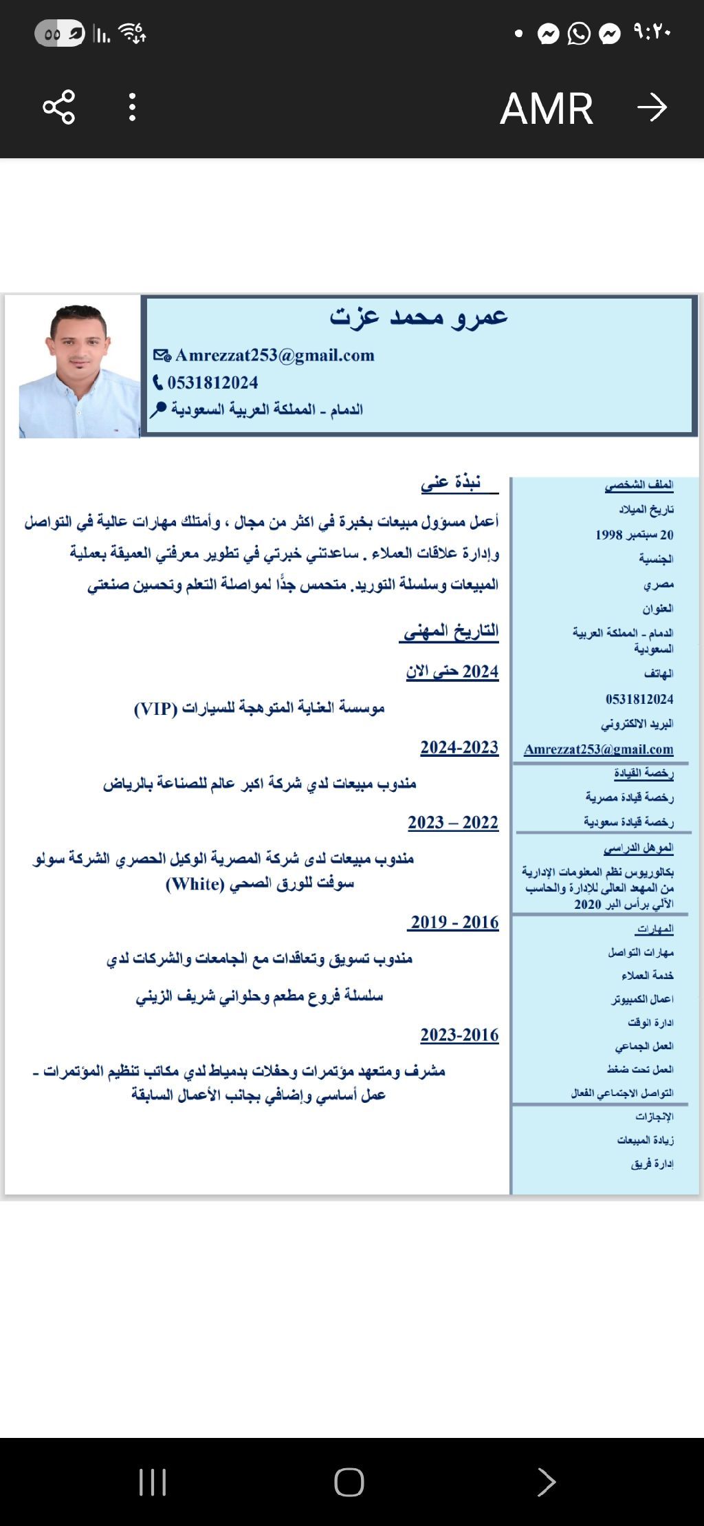ابحث عن فرصة عمل مندوب مبيعات خبرة بالمملكة سنتين ونصف وفي مصر 5 سنوات عملت بمجال بيع الجملة منظفات وغذائي وعملت مبيعات بمراكز عناية السيارات