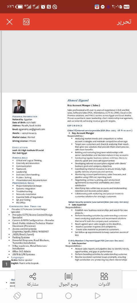 مندوب مبيعات مصري الجنسية ابحث عن فرصة عمل خبرة ثلاث سنوات في السوق السعودية
