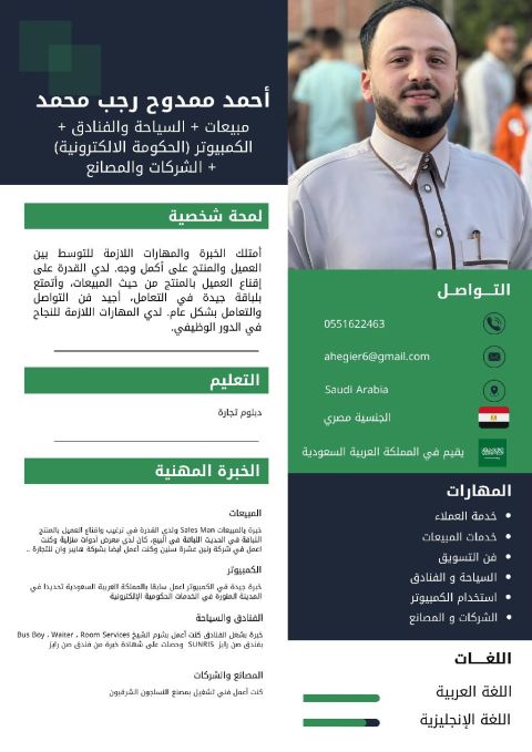 مندوب مبيعات مصري 5 سنوات خبرة عملت مدير فرع للاجهزة الكهربائية مسؤول عن تحريك مناديب واستلام المبالغ المالية واعداد التقارير بالكميات والطلبات وأجيد العمل علي الحاسب الآلي وبرامج المحاسبه وبرنامج الفوتوشوب متواجد داخل المملكة