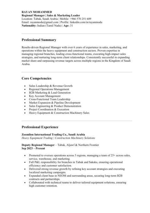 Dear Hiring Manager, I am Rayan Mohammed, an experienced Sales and Operations Leader with over 7 years in the heavy equipment and construction industry across Saudi Arabia. Currently serving as Deputy Regional Manager at Zoomlion, I ve successfully led sales efforts, managed regional teams, and built strong client relationshipsparticularly in the Tabuk, NEOM, and Northern regions. I am now seeking to