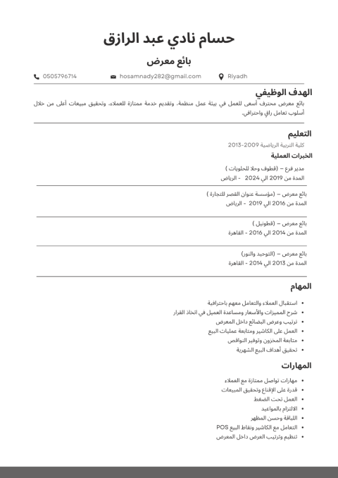 بائع معرض خبرة في خدمة العملاء والمبيعات، قادر على تحقيق أهداف البيع والتعامل مع العملاء باحترافية. ملتزم بالمواعيد ولبق في التعامل. جاهز للعمل فورا