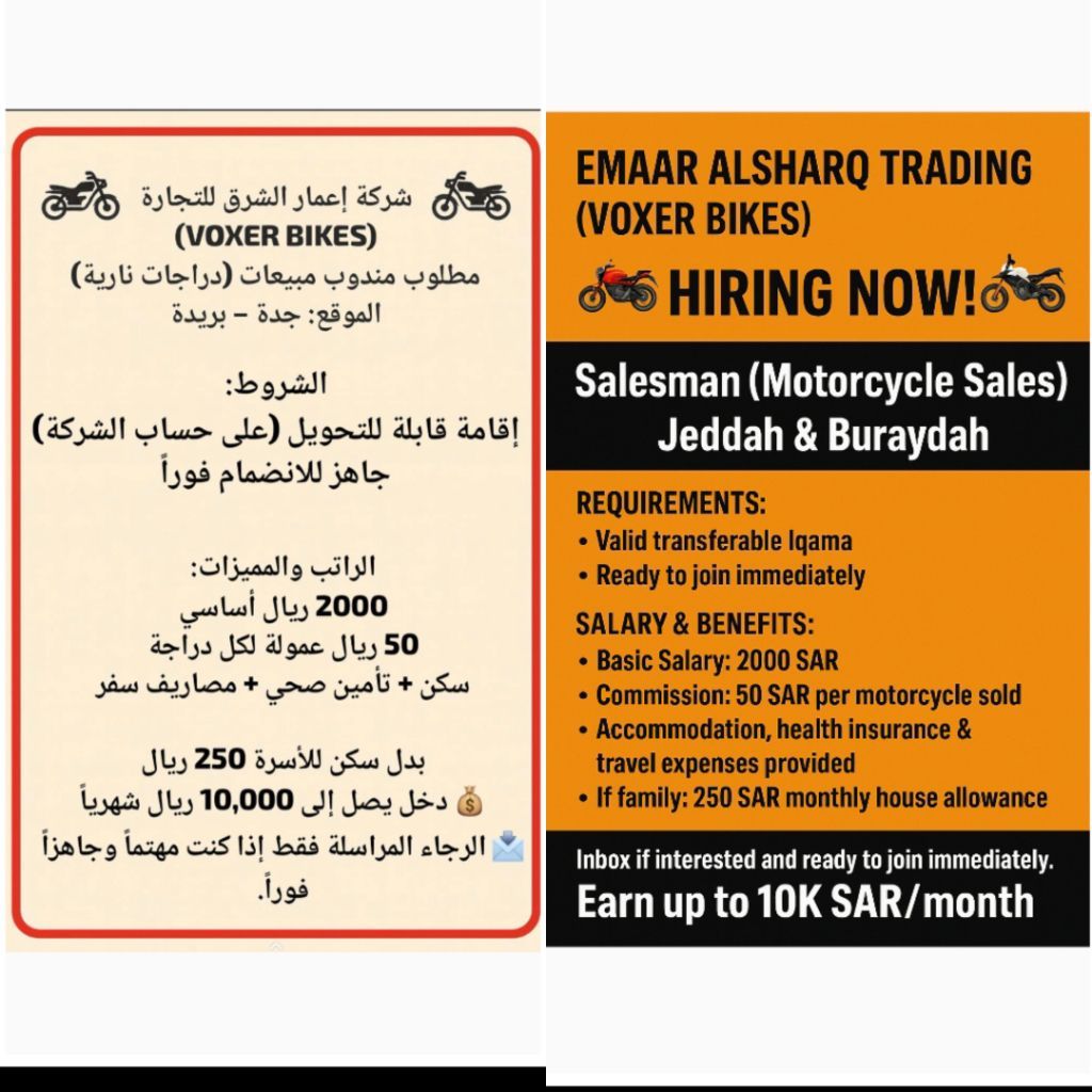 Job Vacancy field Sales Representative (Motorcycles) Company Emaar Al Sharq Trading Co. CR 1131989755 - License 45011284269 Job Locations Unaizah Building No. 2612, Sakhar Ibn Ummaiyah Al Salami Street, As Sulimaniyah District, Postal Code 56463, Unaizah, Al Qassim, Kingdom of Saudi Arabia Jeddah Industrial Area, Jeddah, Saudi Arabia Buraydah Aswaq Mecca, Al Wihdah, Al Rabee District, Postal