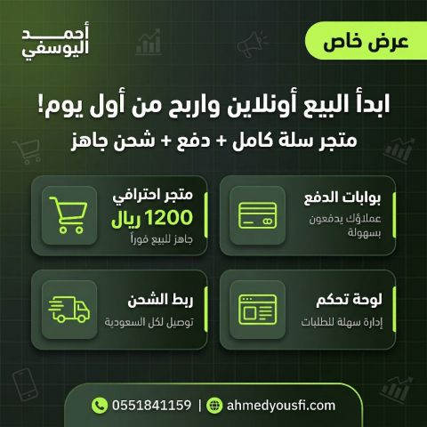 Start selling online from the first day of the offer of creating and designing a full basket store + activating payment methods and shipping companies, only 1200 riyals and your store is ready for sale and receiving orders, to communicate