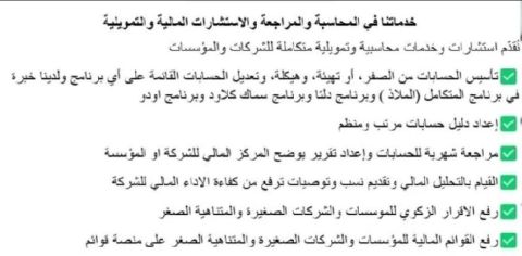 تقديم خدمات محاسبيه للمؤسسات والشركات من بداية تأسيس شجرة الحسابات وعمل قيود يوميه وتقارير شهريه ومتابعه العهد والعملاء والمرتبات ورفع المرتبات علي مدد ورفع الاقرارات الضريبة وتخليص معاملات المواقع الحكوميه قوي ابشر التأمينات الاجتماعيه