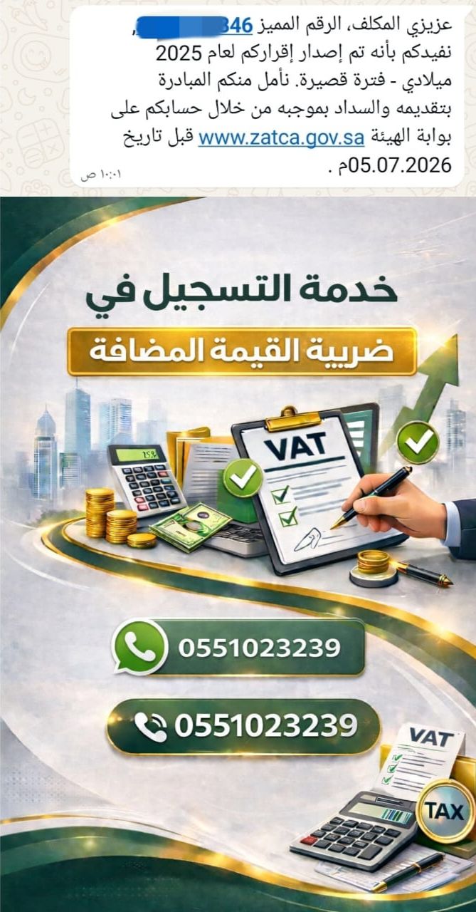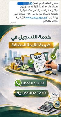 نقدم لكم خدمة التسجيل في ضريبة القيمة المضافة للشركات والمؤسسات وكذلك طباعة شهادة التسجيل ورفع الاقرار الضريبي للمنشأة