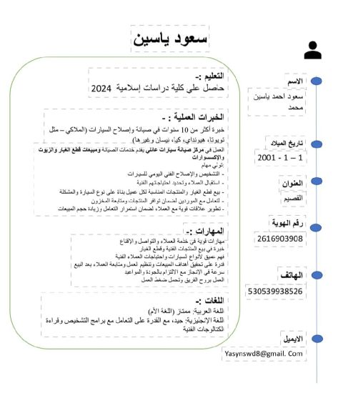 الجنسية. اليمن ميكانيكي صيانات شاحنات متحمس للغاية ومركز على النتائج يتمتع بخبرة تزيد عن عشر سنوات في صيانات الشاحنات سجل حافل بنجاح في قيادة فرق الصيانة عالية الأداء الى النجاح ماهر في تشخيص الأعطال وإصلاحها واصلاح محركات الشاحنات شغوف بضمان عمليات سلسة ومتميز في حل التحديات الميكانيكيه المعقده مع الالتزام بأعلى معايير السلامة ولوائح الأسطول