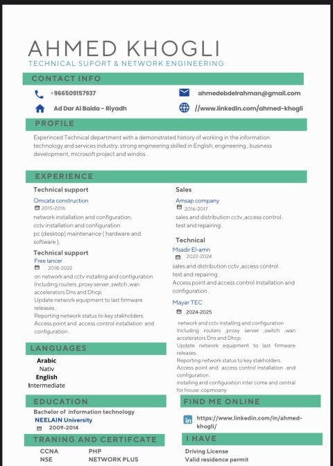 مهندس تقنية معلومات لدي خبرة في تركيب الشبكات وصيانتها، لدي خبرة في تركيب الكاميرات بجميع أنواعها وصيانتها وأيضا خبرة في تركيب الانتركوم والسنترالات لي المنازل الكبيرة، خبرة في لحام الفايبر ونقله، وتركيب وتمديد وبرمجة المقويات بمختلف أنواعها، علاقات جيدة بالموردين لمختلف الاجهزة، وأيضا خبرة في ادارة المشاريع وعروض الأسعار خبرة في الاشراف والتسليم والتعامل مع الاستشاريين