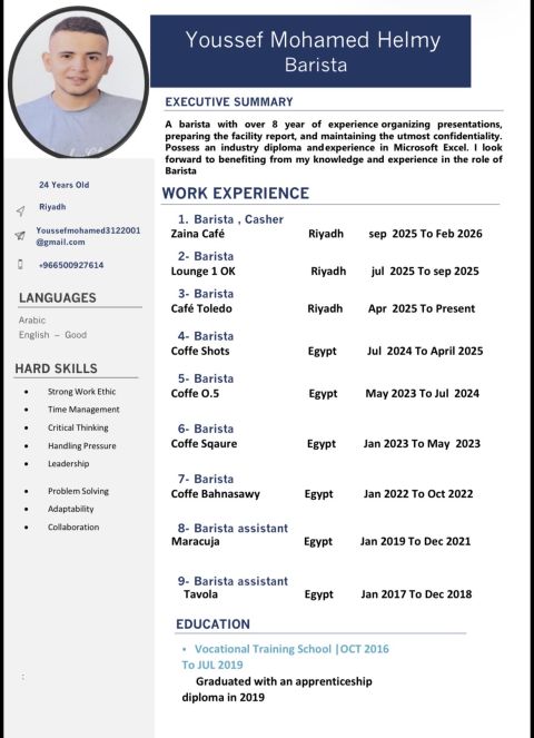 باريستا خبرة 8 سنوات مقيم بي الرياض ابحث عن دوام كويس