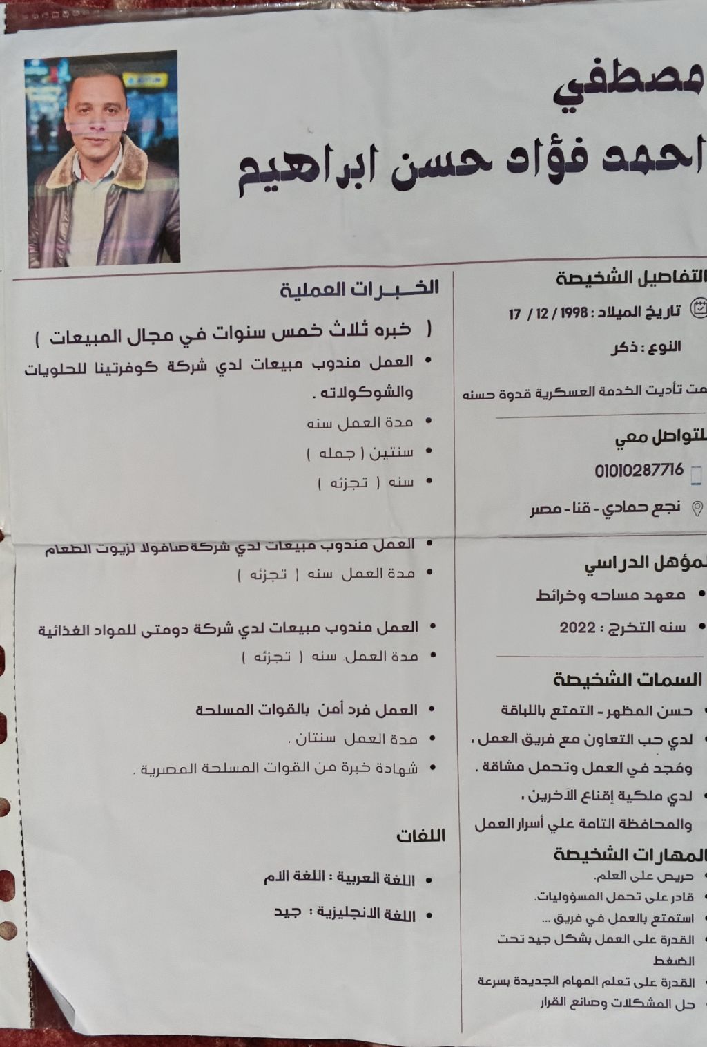 الاسم مصطفى أحمد السن / 26 خبرة/ 7 سنوات في المبيعات تجزئة وجملة شركة صافولا لزيوت الطعام المصريه شركة كوفرتينا للحلويات والشكولاته المصريه شركة مكسيلو للحلويات المصرية شركة دوم تي للجبن والعصير المصريه شهادة خبرة كفرد أمن داخل الوحدة العسكرية اشتغل أي شيء مش شرط مجالي متواجد في محافظة المجمعة للتواصل