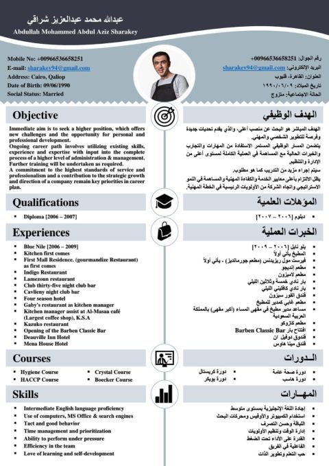 شيف عمومي متميز - يبحث عن فرصة وظيفيه لدية خبرة مهنية تزيد عن 20 عاما في مجال الطهي، يبحث عن فرصة عمل جديدة وتحد جديد في شركة مرموقة. يتمتع الشيف بمهارات استثنائية في فنون الطهي وإدارة المطابخ، ويقدم قيمة مضافة لأي فريق ينضم اليه. الخبرات والمهارات خبرة واسعة في اعداد وتقديم الأطباق المتنوعة. إدارة وتنظيم المطابخ باحت