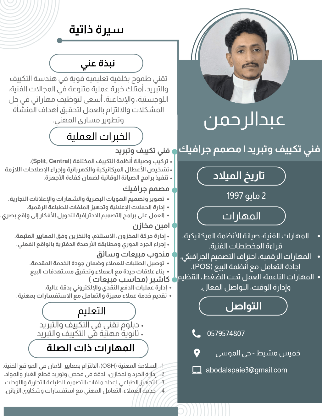 ابحث عن عمل أنا فني تكييف وتبريد وعندي خبرات ممتازة وهي التالي - تصاميم الجرافيك (صنع هوية متكاملة) كاشير - أمين مخازن - مندوب مبيعات
