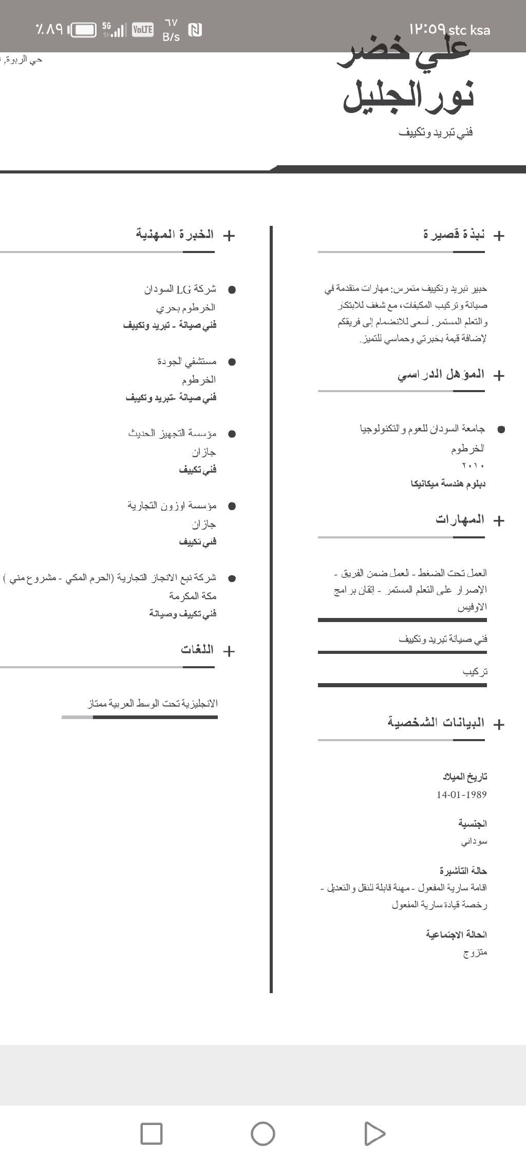 فني تبريد وتكيف سوداني الجنسية خريج جامعة السودان دبلوم هندسة ميكانيكية تبريد وتكيف خبرة أكثر من 12 عام في تركيب المكيفات والصيانة وتمديد النحاس إقامة قابلة للنقل ومعي رخصة قيادة