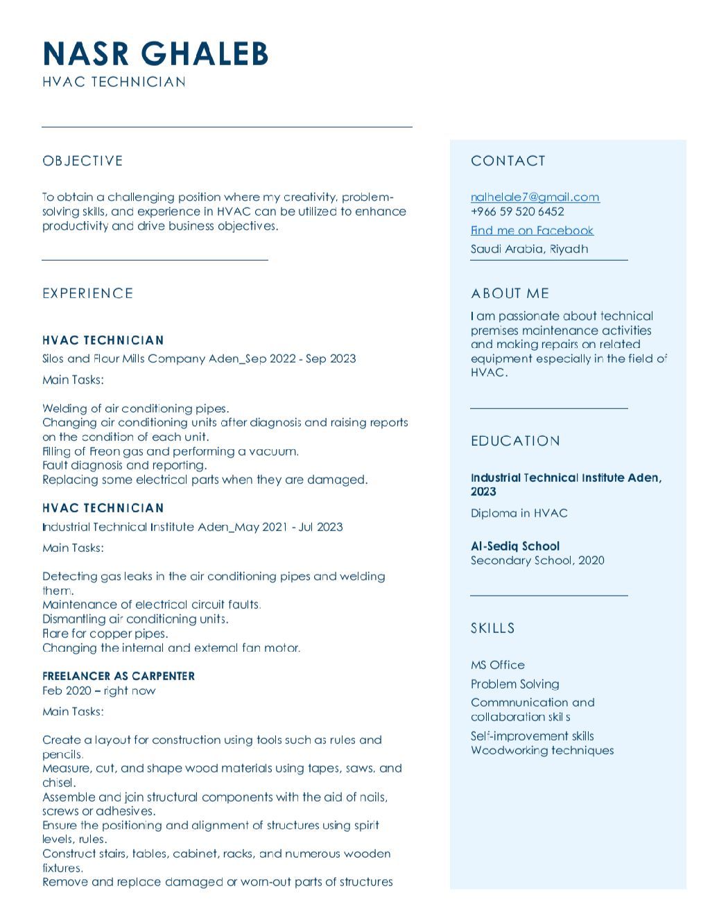 أنا فني تكييف وتبريد مقيم في السعودية، ابحث عن عمل في مجال التكييف والتبريد حاصل على شهادة دبلوم بنفس التخصص وقد سبق لي الشغل في بعض الشرائك في اليمن بنفس التخصص. الجنسية يمني