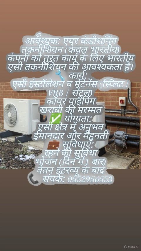 مطلوب عدد 5 فنيي تكييف على دراية بأعمال تأسيس VRF VRV ع وجهة السرعة. فطور + غداء ع الشركة + السكن + الانتقالات. مطلوب عدد 4 فني معلم ساس صاج وتركيب تفصيل راتب 2000 جنسية بنغالي هندي دوام من 6 ل 3:30 نقل كفالة بعد تجاوز مدة الاختبار من شهر ل شهرين الرياض العليا