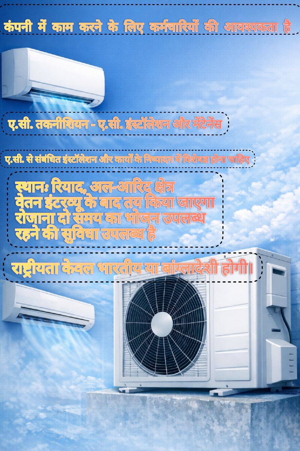 AC Technician Required Experience in installation and maintenance of air conditioning systems Must have a valid driving license Nationality Indian or Bangladeshi only Accommodation provided Daily meal provided Salary after interview