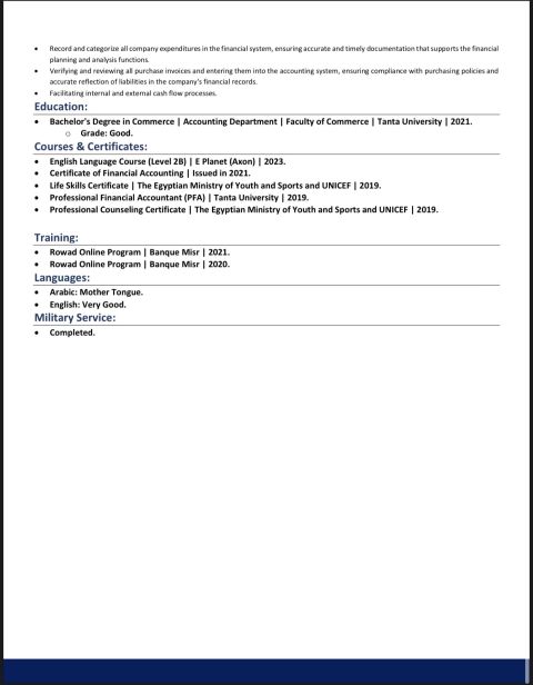 محاسب عام مصري خبرة 8 سنوات خبرة في اعداد الاقرارات الضريبية ورفعها على موقع الذكاة والدخل التسجيل والغاء التسجيل في الضريبة واسترداد الضريبة اعداد شجرة الحسابات لجميع المجالات اعداد قيود اليومية وعمل ميزان المراجعة مطابقة الحسابات البنكية وعمل التسويات البنكية مطابقة حسابات العملاء وحسابات الموردين اعداد التقارير الخاصة بالمبيعات والمشتريات خبرة في البرامج المحاسبية مثل سماك ودفتره وبنودي وقيود