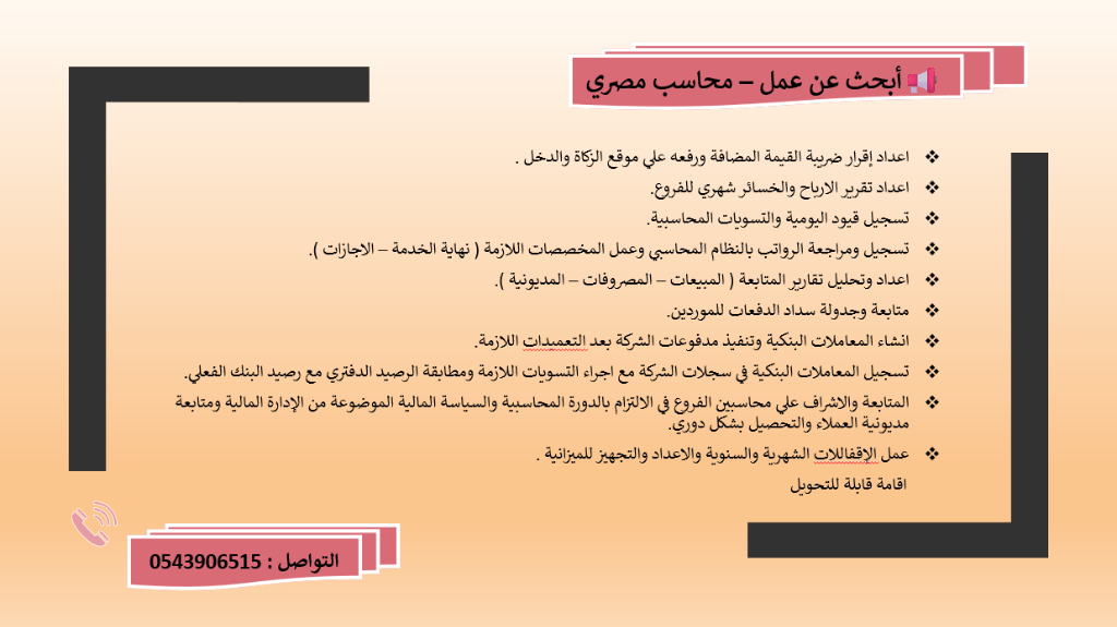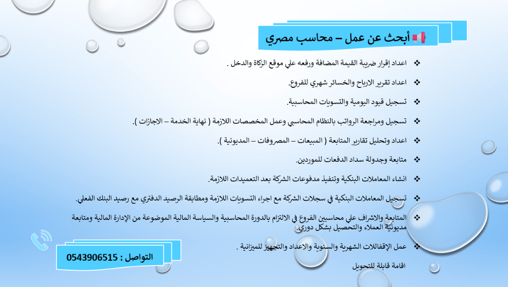 ابحث عن عمل - محاسب مصري اعداد اقرار ضريبة القيمة المضافة ورفعه علي موقع الزكاة والدخل واعداد تقرير الأرباح والخسائر شهري للفروع وتسجيل قيود اليومية والتسويات المحاسبية وتسجيل ومراجعة الرواتب بالنظام المحاسبي وعمل المخصصات اللازمة (نهاية الخدمة - الاجازات) واعداد وتحليل تقارير المتابعة (المبيعات - المصروفات - المديونية) ومتابعة وجدولة سداد الدفعات للموردين وانشاء المعاملات البنكية وتنفيذ المدفوعات