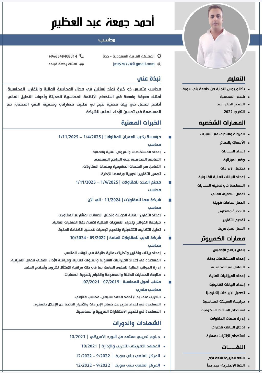 ابحث عن وظيفة محاسب ملم بالقوائم الماليه والضرائب وألذ كأه تسجيل ومتابعه البيانات ومطابقه البنوك وكشوف حساب الموردين والعملاء متابعه وربط المخزون بالمشتريات عملت علي برنامج المتكامل وقيود ودفتره لدي شهادة mos في اجادة الحاسب الآلي عملت بمصنع امجاد للمقاولات وشركة إبراهيم الم عأوي للمقاولات مؤسسة ركيب العمران لدي رخصة قيادة جاهز للعمل في أي مكان بالمملكة اجادة اللغة الانجليزية تحدث وكتابة