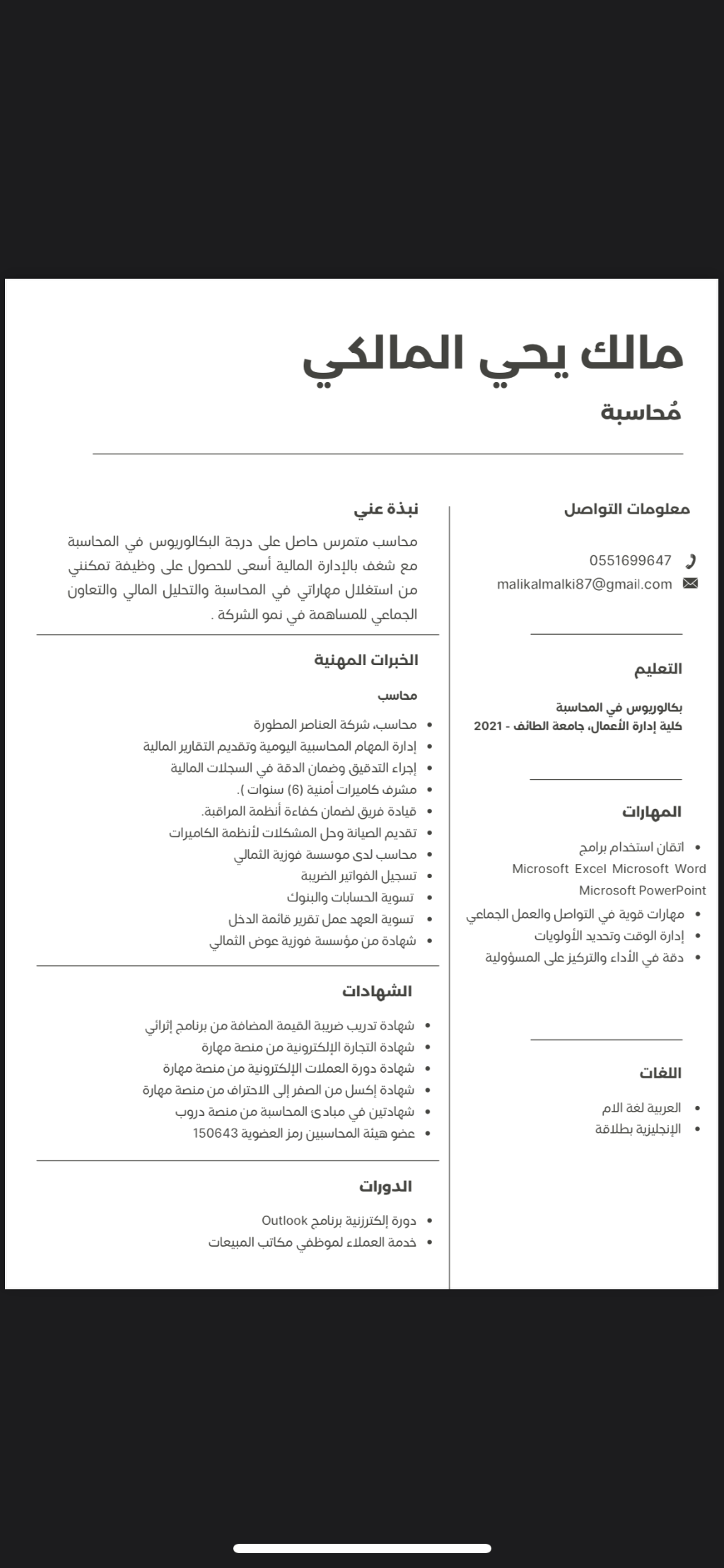 ابحث عن عمل سعودي محاسب لدى خبرة عملت لدى شركة مقاولات ويوجد لدى دورات تدربية بالضريبة المضافة كذلك دورة بالاكسل يفضل العمل في مكة جدة الطائف