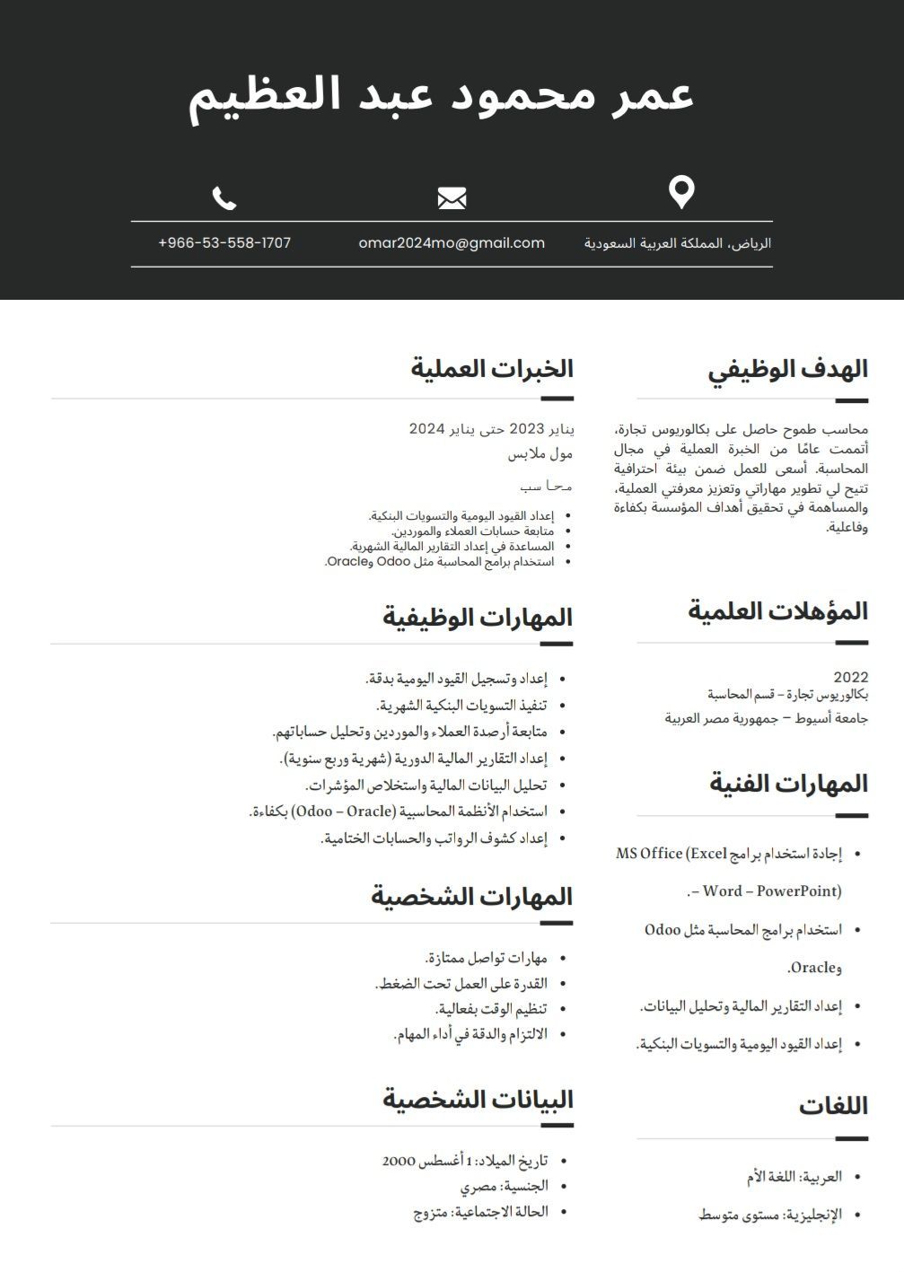 محاسب خبرة في الحسابات والبرامج المحاسبية والضرائب قادر على عمل القيود اليومية وتسوية حساب البنك ومتابعه العملاء والموردين وتصفية العهده خبرة في ترتيب الأوراق والفواتير المحاسبية بشكل صحيح اشتغلت ع برنامج odoo وبرنامج orcal خبرة سنتين في شركة مدينة العشره التجاريه للملابس ابحث عن دوام كامل