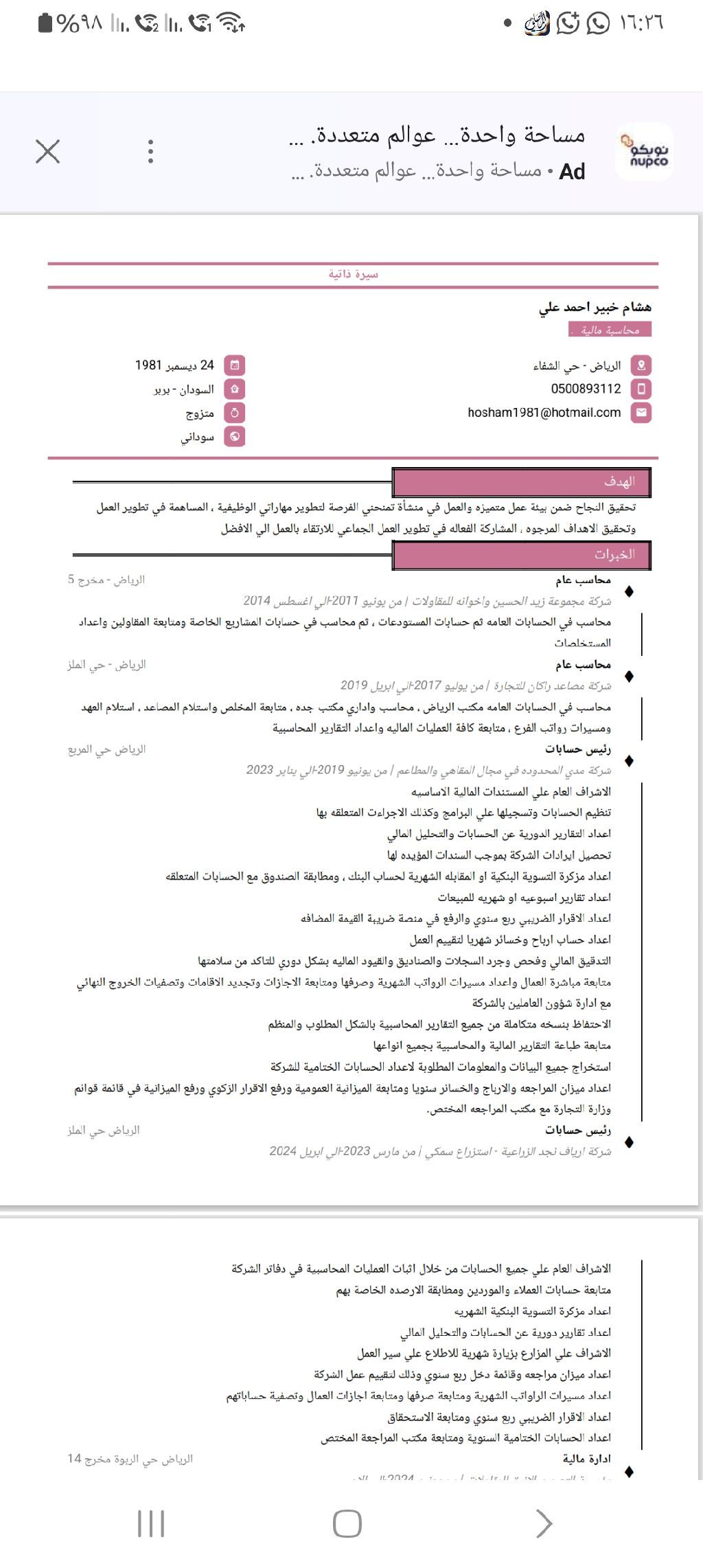 هشام خبير محاسب ومدير حسابات خبرة أكثر من 10 سنوات داخل المملكة العربية السعودية سوداني الجنسية الالمام التام بكافة مراحل الدورة المحاسبية وادارتها والتعامل مع مكاتب المراجعة الخارجية واعداد الاقرارات الضريبيه واعداد الحسابات الختاميه وتسوية الحسابات ابحث عن عمل بدوام كامل أو دوام جزئ