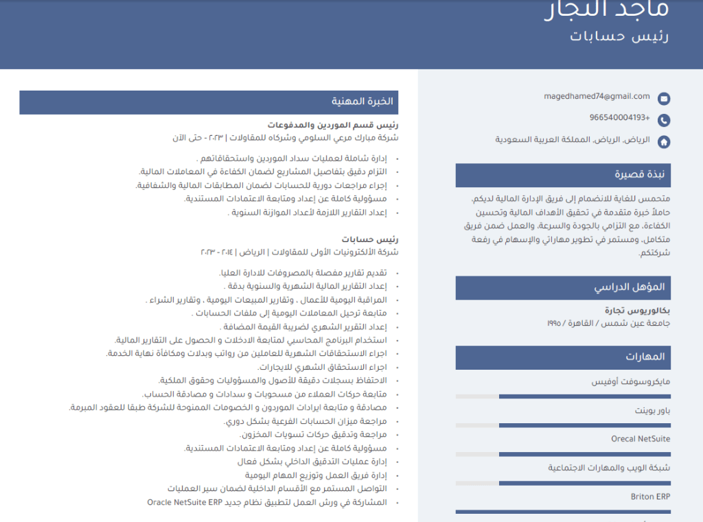 رئيس حسابات ومحاسب عام يمتلك أكثر من 25 عاما من الخبرة في المحاسبة والإدارة المالية. يعمل حاليا رئيس قسم الموردين والمدفوعات في احدى شركات المقاولات (2023 - حتى الآن) شغل سابقا منصب رئيس حسابات في شركة كبرى لتجارة الاجهزة المنزلية والالكترونيات (2009 - 2023) يمتلك خبرة واسعة في الأنظمة المحاسبية المتقدمة مثل Oracle NetSuite - Briton ERP - Ascon ERP - Nama القدرة على إدارة فرق العمل المحاسبية