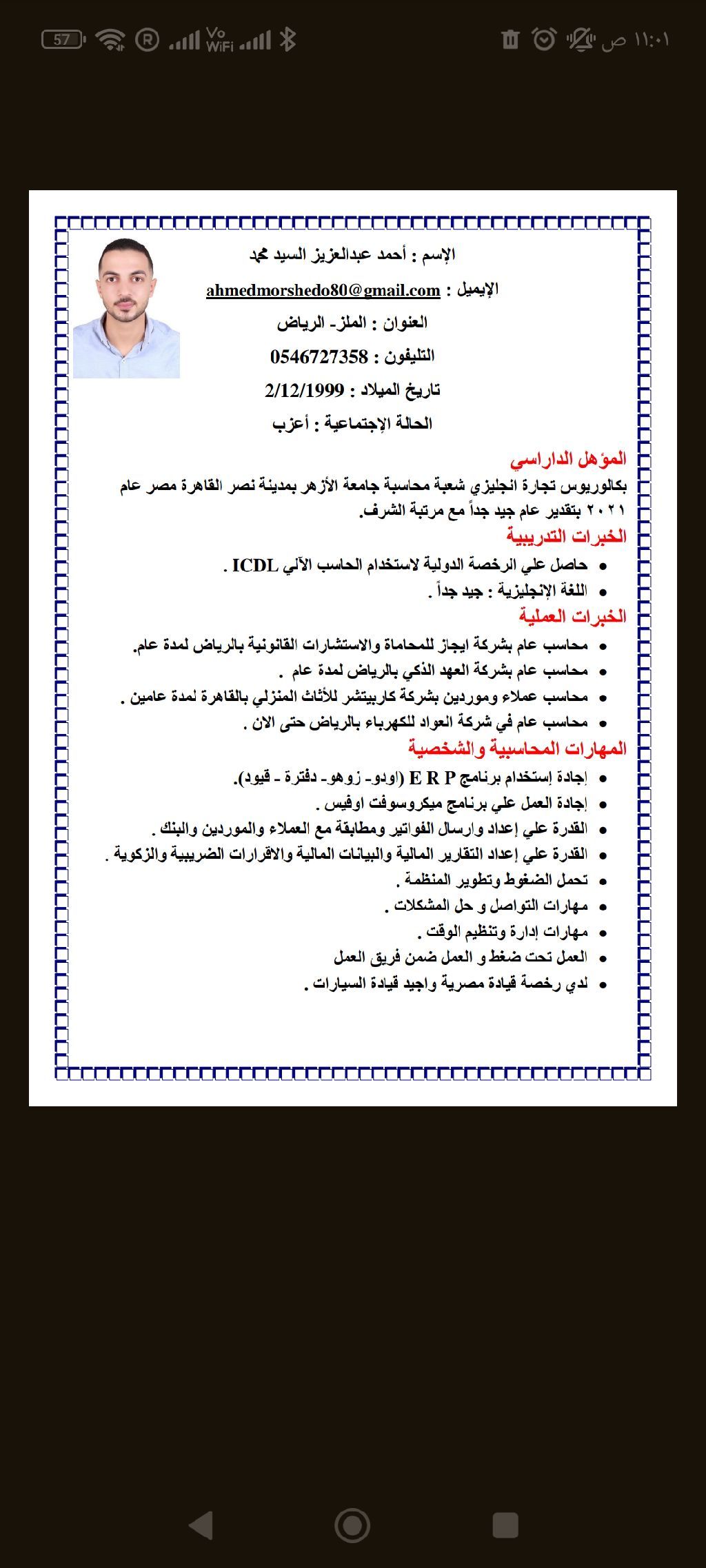 ابحث عن عمل كمحاسب بدوام جزئي. بكالوريوس تجارة انجليزي. خبرة 4 سنين كمحاسب عام وعملاء وموردين. اعداد التقارير المالية. اعداد الفواتير وارسالها للعملاء والموردين والمطابقة معهم. مطابقة رصيد البنك مع السيستم. اعداد الاقرارات الضريبية والزكوية وتقديمها للهيئة. اعداد القوائم المالية
